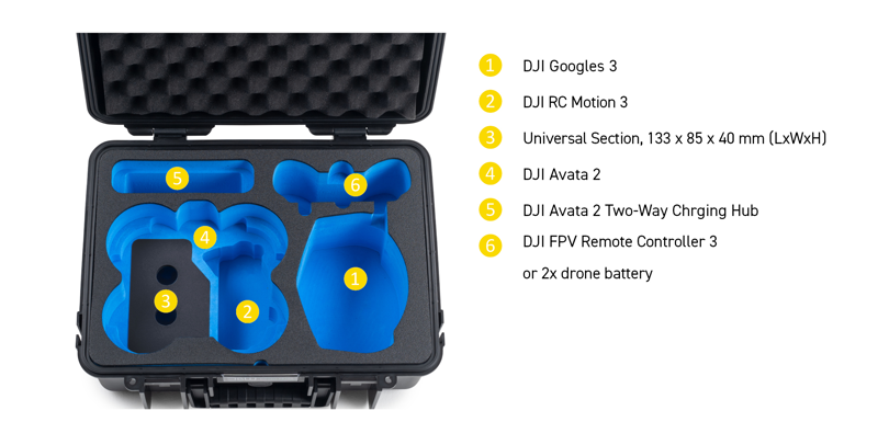 PERFECT ORGANIZATION: A drone is a valuable investment and should be transported with maximum protection together with its accessories. The outdoor.case 4000 with a custom foam insert for the DJI Avata 2 or DJI Avata 2 Fly More Combo provides dedicated space for the drone, DJI FPV Motion Controller 3, DJI RC Motion 3, DJI Goggles 3, and additional accessories such as spare propellers. Depending on the configuration, the case can securely hold up to six drone batteries (including one installed in the drone).